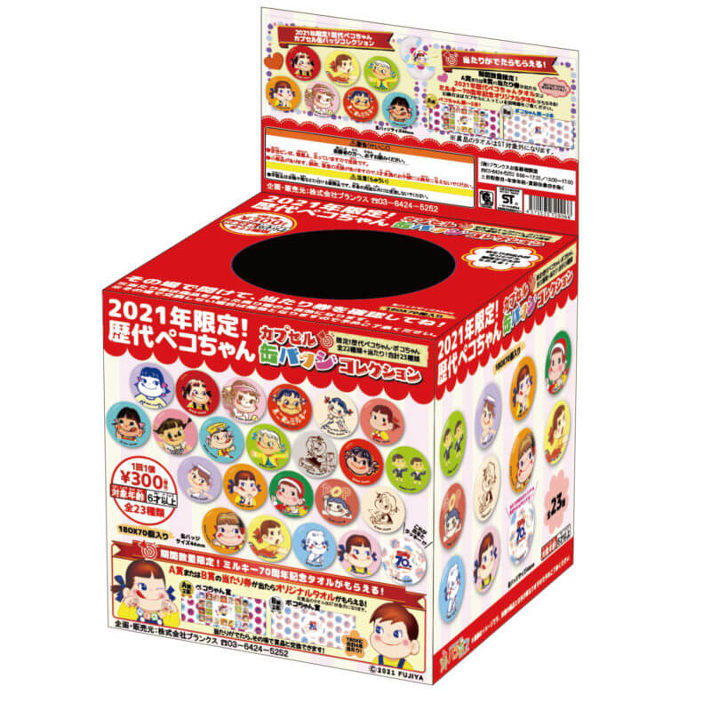 ぺこちゃんガチャポンデザイン 2023.08.07 ●使用ソフト:Illustrator Photoshop ●制作期間 5ヶ月 缶バッチのデザイン、パッケージのデザイン、オリジナルタオルのデザインや見本作成など行いました